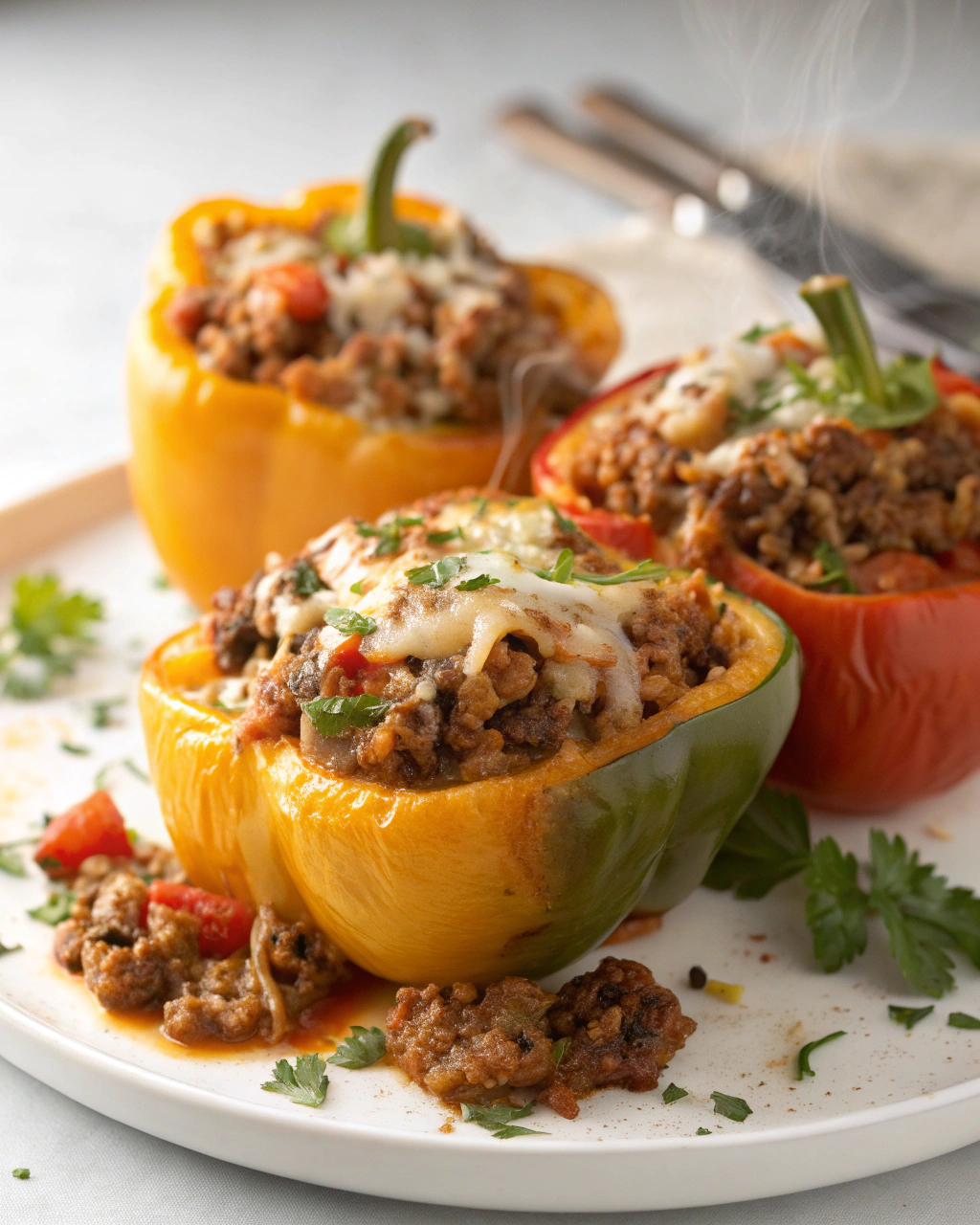 Let the peppers rest for about 5 minutes before serving so the filling firms up a touch. Garnish with chopped parsley or basil for a fresh color pop. Slice one open and listen to that satisfying steam escape. Serve warm and dig in.