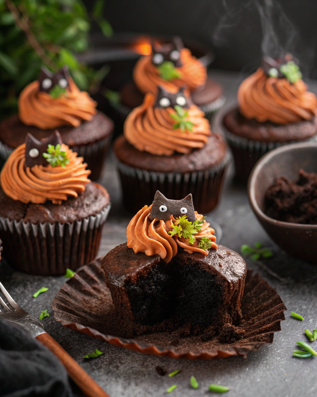 Frost each cupcake with a generous swirl. Then, use black decorating gel or a black icing pen to draw cute cat faces—pointy ears, little whiskers, and a mysterious grin. Add mini chocolate chips or candy eyes for the cutest creepy effect!
