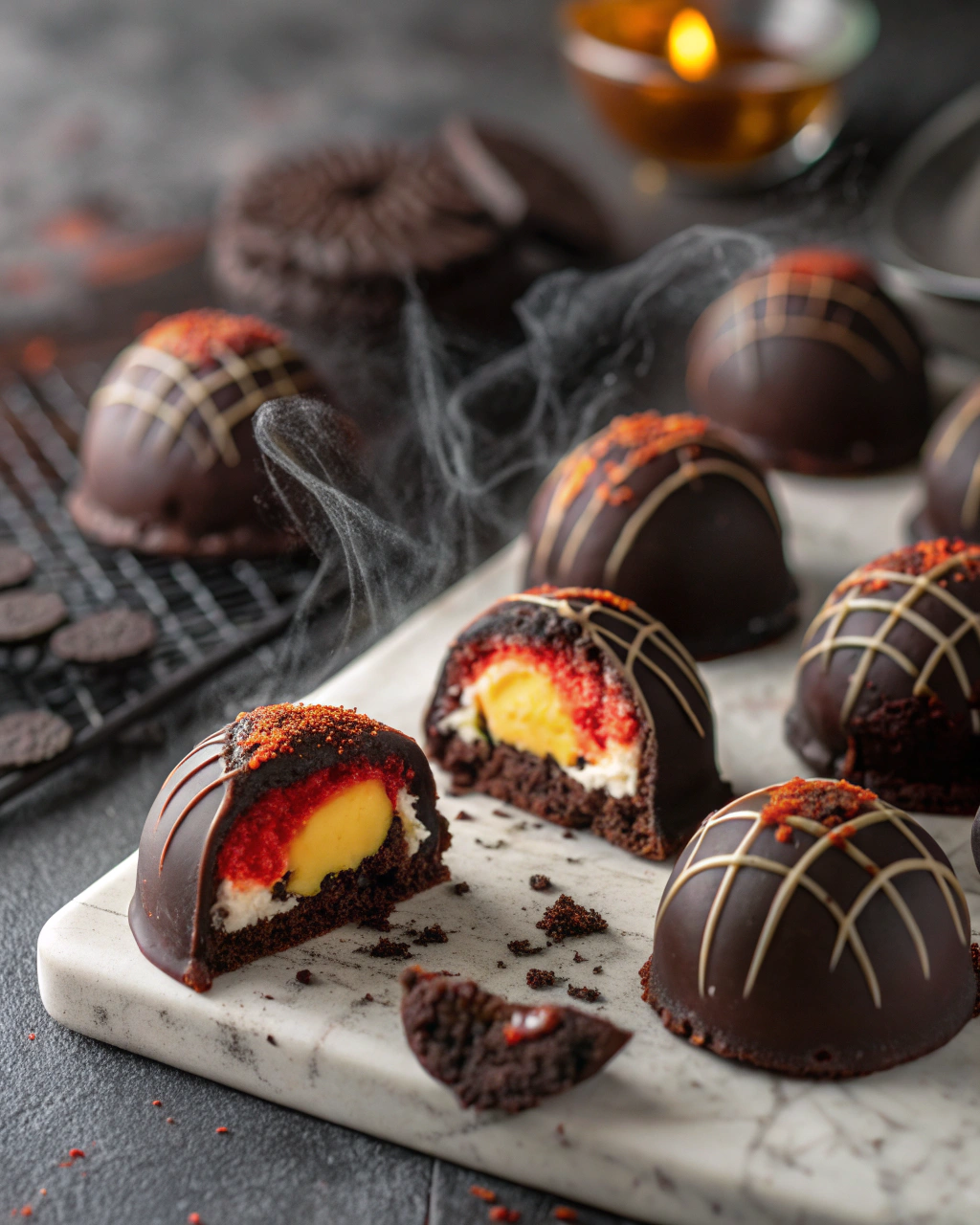 Final spooky touch: drizzle the red candy melts or decorating gel over each truffle for that “bloody” black widow effect. Add edible eyes or little black sugar pearls to create spider faces if you’re feeling crafty. Refrigerate again until the chocolate sets—about 30 minutes.