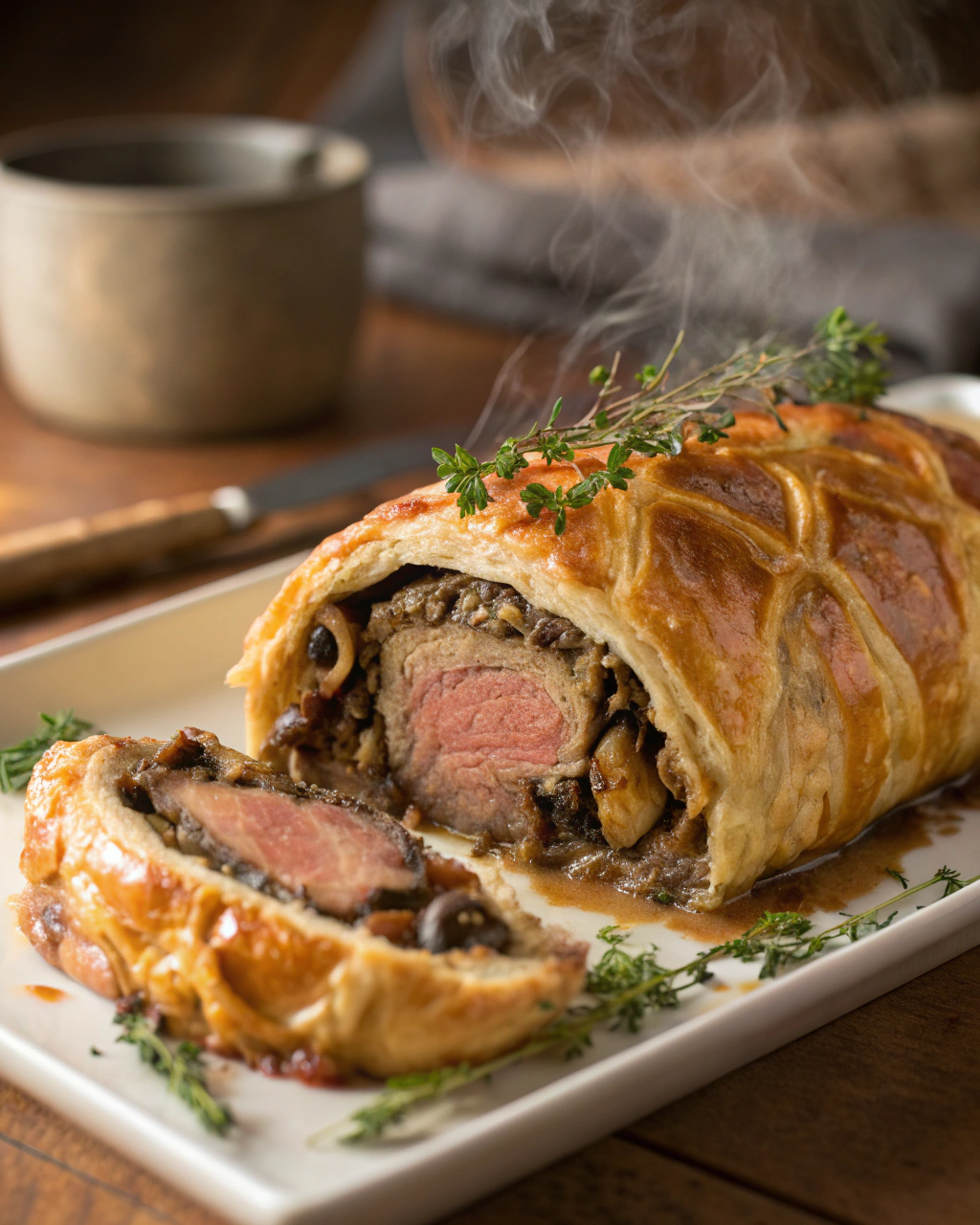 Classic Beef Wellington Wrapped in Puff Pastry with Savory Mushroom Duxelles
