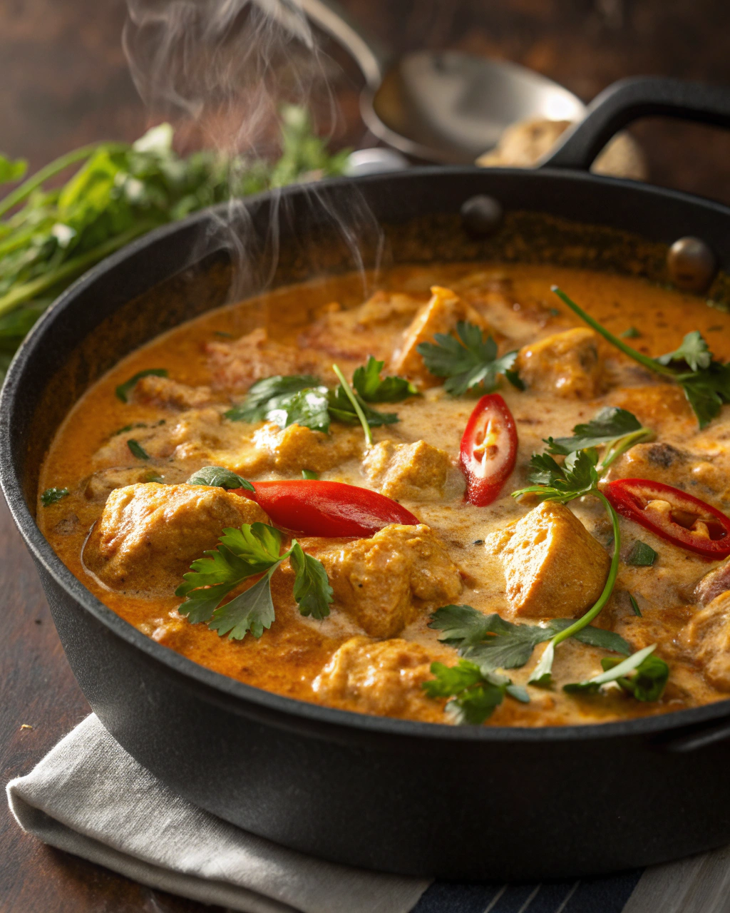 Turn the heat to low and stir in 3/4 cup heavy cream (or fold in Greek yogurt off the heat to avoid curdling). Add lemon juice if you like a little lift. Finish with an extra 1 tbsp butter for shine, sprinkle with chopped cilantro, and let the curry rest for 3–5 minutes before serving so flavors settle.
