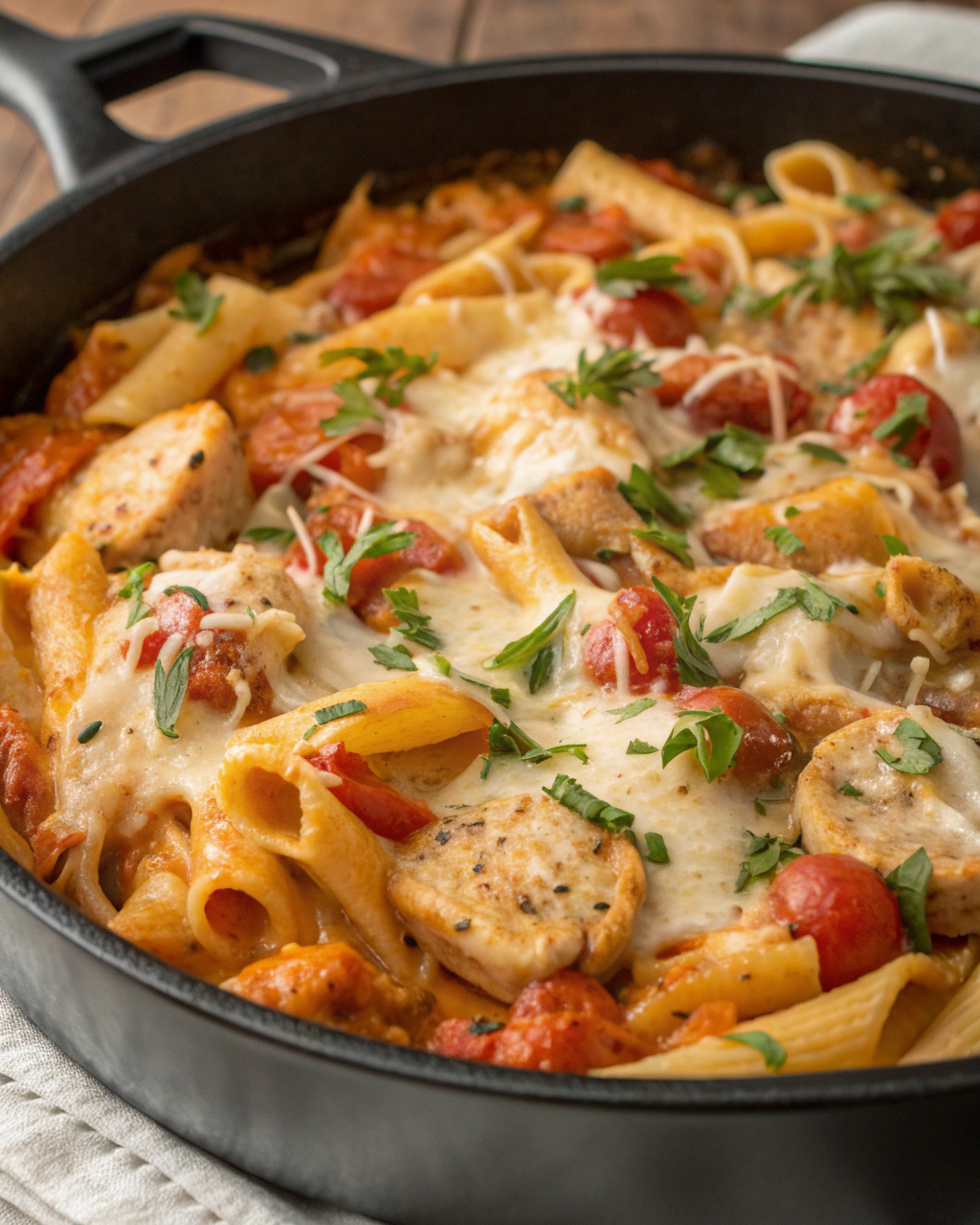 Return the browned chicken to the skillet along with the cooked pasta. Toss everything together gently, making sure each piece is coated in that dreamy sauce. Finish with fresh basil leaves and extra Parmesan if you’re feeling fancy!