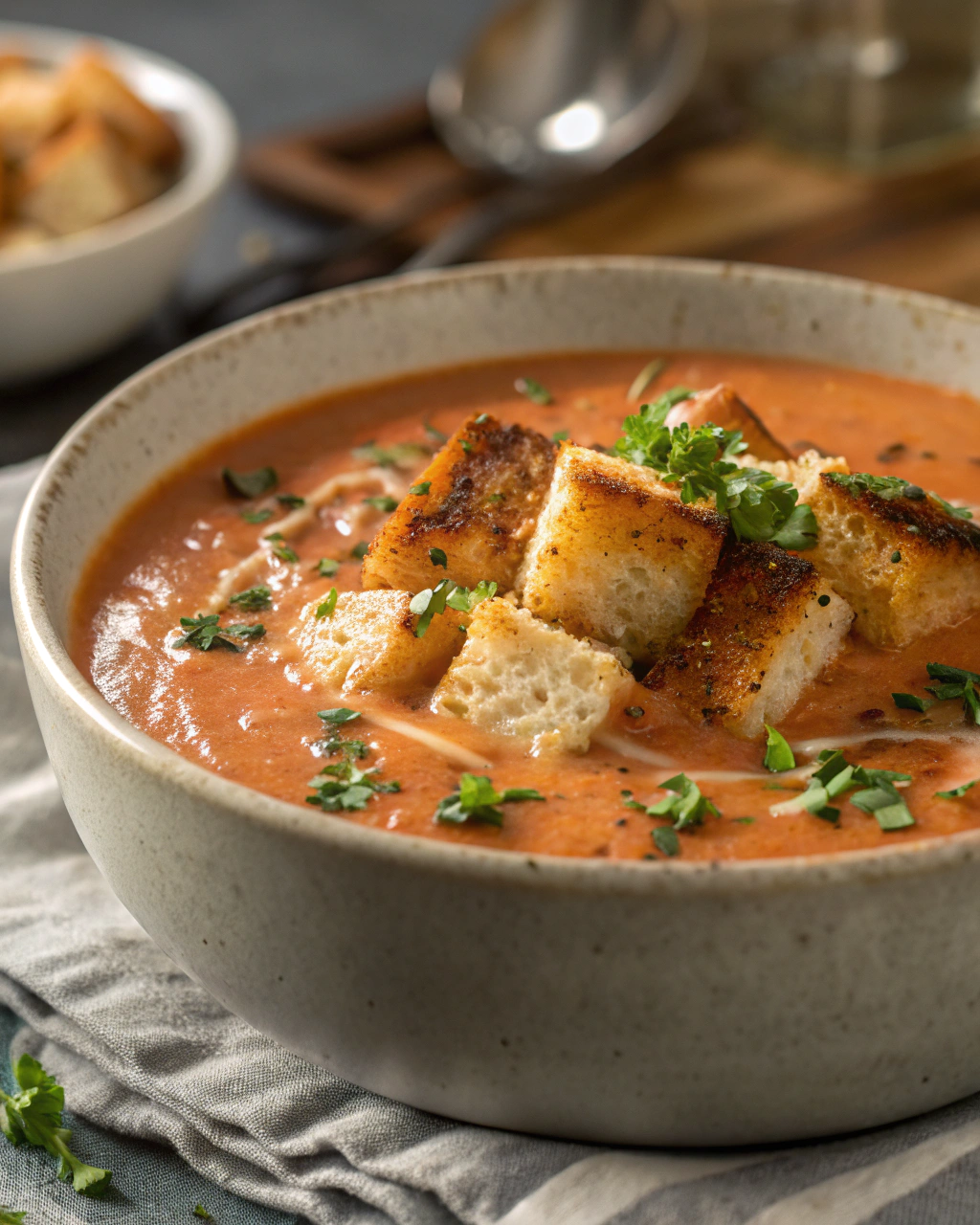Closing: This creamy tomato bisque with grilled cheese croutons is one of those simple but dazzling recipes that fills your kitchen with warmth and leaves everyone asking for seconds.