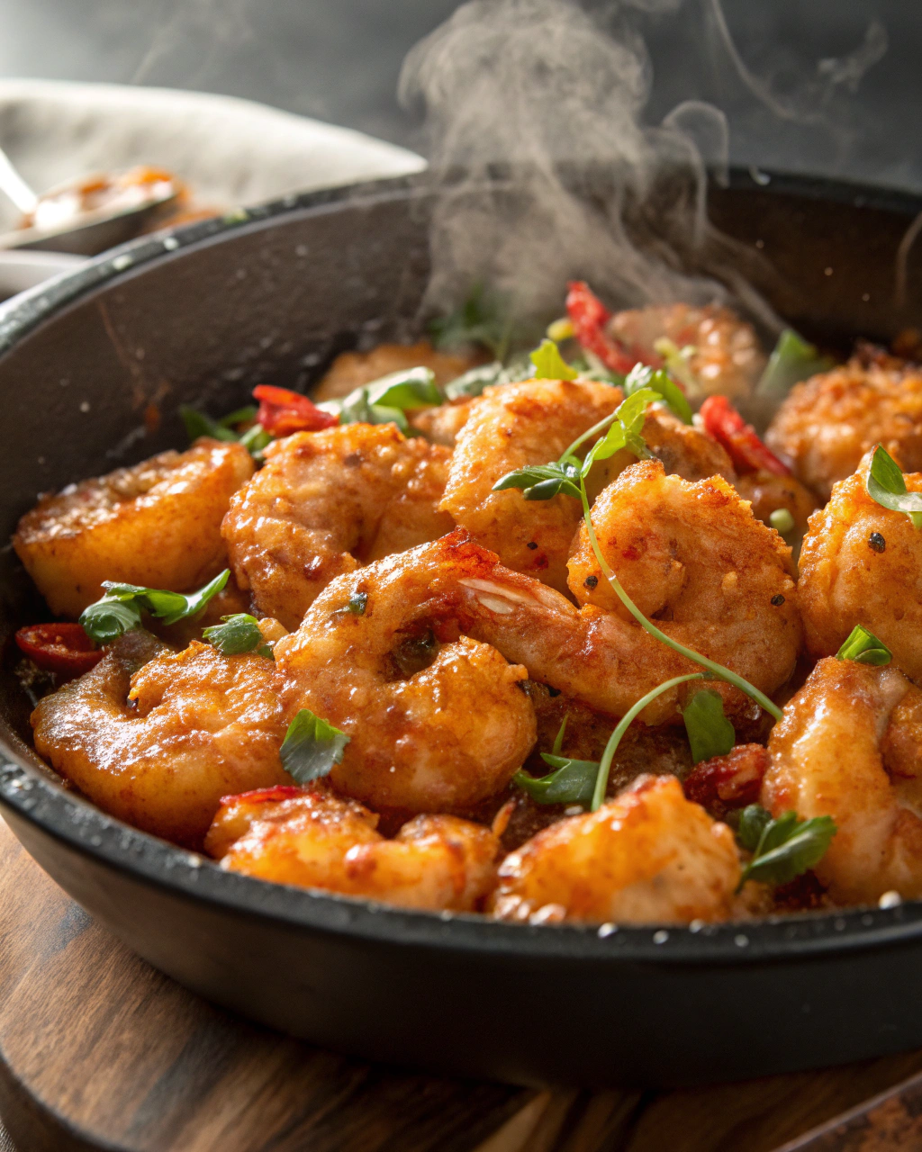 Heat the vegetable oil in a large skillet over medium-high heat. When the oil shimmers (around 350°F if you’re using a thermometer), carefully place the shrimp in the pan in a single layer. Avoid overcrowding—they need room to crisp up.