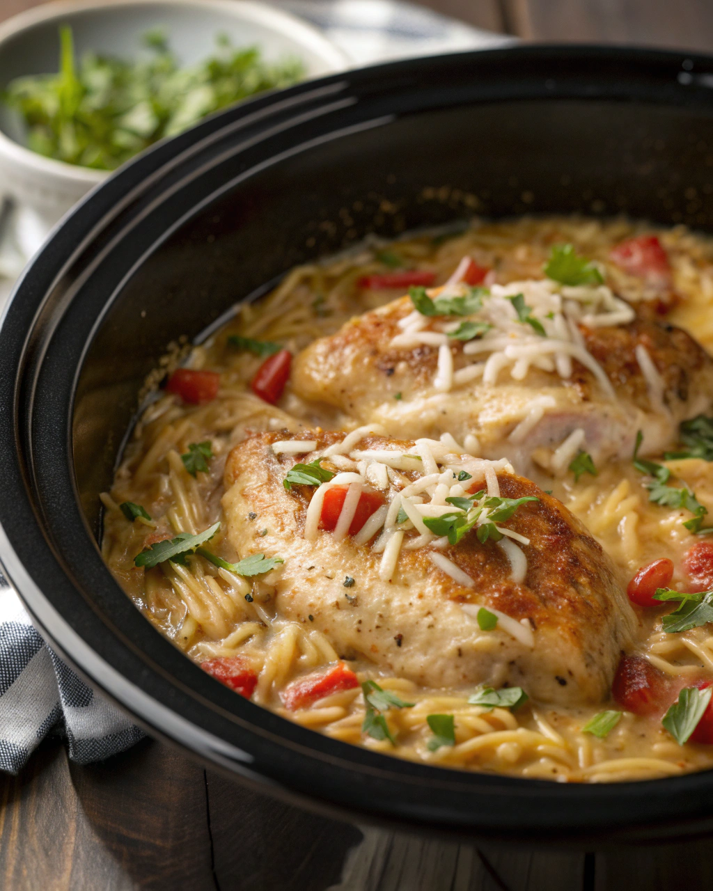 Cover and cook on low for 3 hours. The chicken should be juicy and fully cooked (internal temp of 165°F), and the orzo tender but not mushy.
