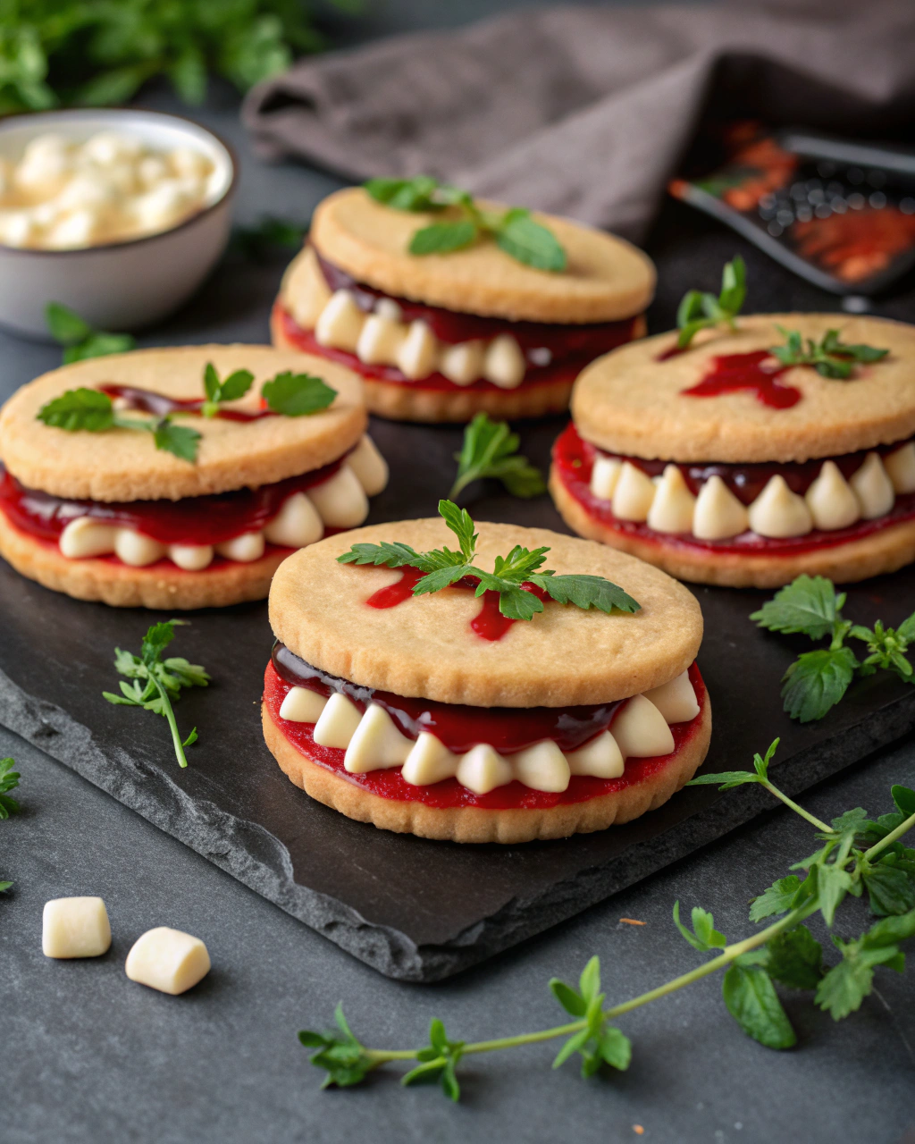 Once the cookies cool just enough, spread a thin layer of your chosen red jam along the edge between the almond teeth and cookie base for that juicy, “gummy” look. Let the jam set before serving to avoid stickiness.