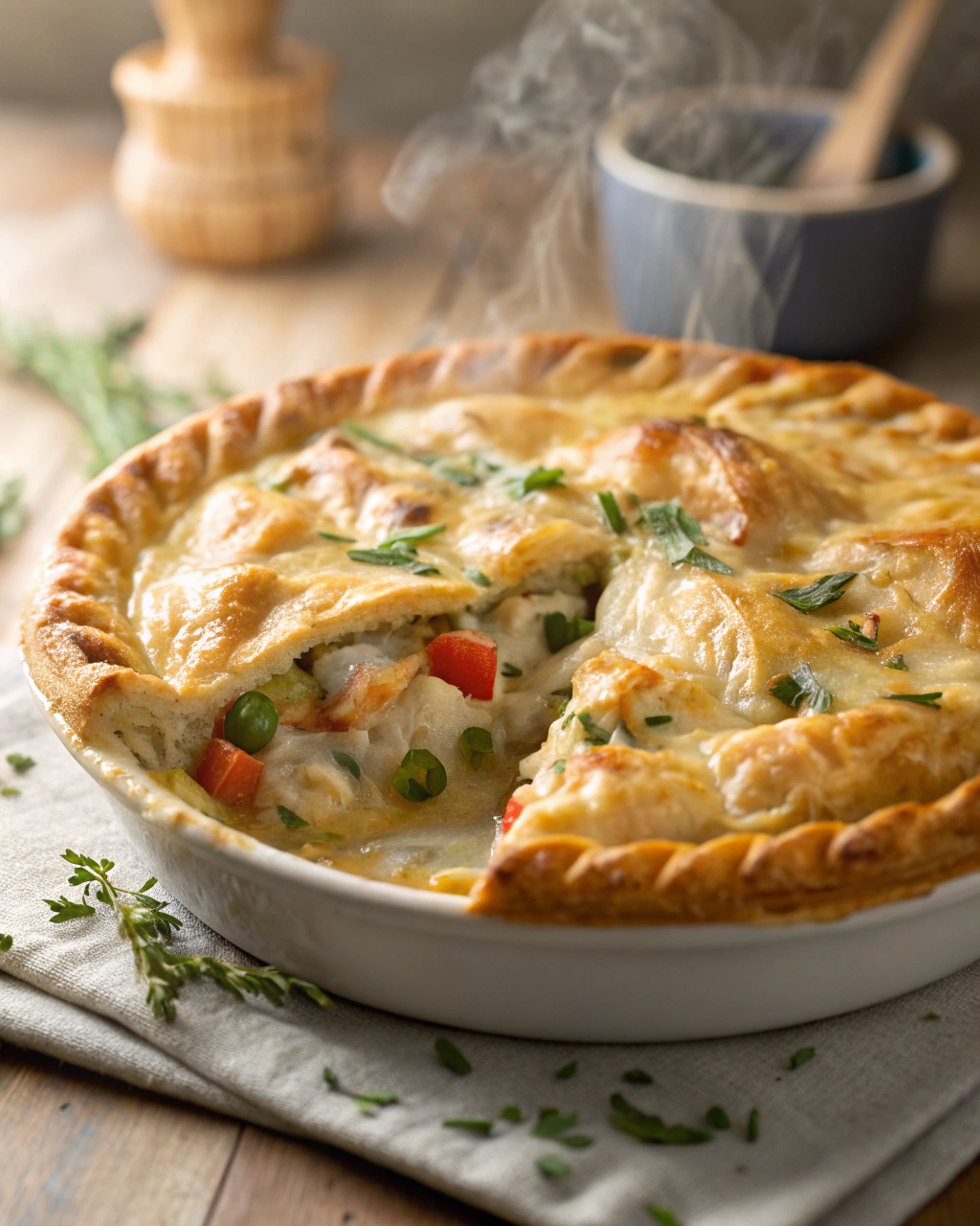 I love the moment when the whole kitchen smells like warm butter and rosemary — it takes me straight back to slow Sunday afternoons. This chicken pot pie plays that comforting scene on repeat: flaky crust, creamy filling, bright peas and carrots, and juicy bites of chicken that make everyone sigh with contentment. I built this recipe for busy cooks who want homemade flavor without complicated steps. The crust browns to a golden, crackly top while the filling simmers into a thick, spoon-worthy hug. Follow my easy swaps and timing cues, and you’ll have a crowd-pleaser that feels fancy but behaves like a weeknight champion. Let’s get cozy and make something that smells like home.