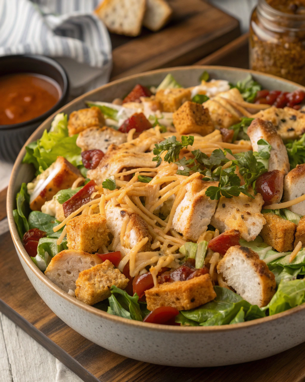 - The salad doesn’t “cook,” so look for creamy dressing, evenly coated chicken, and crunchy veggies. Taste for balanced salt and lemon — that’s your doneness cue.