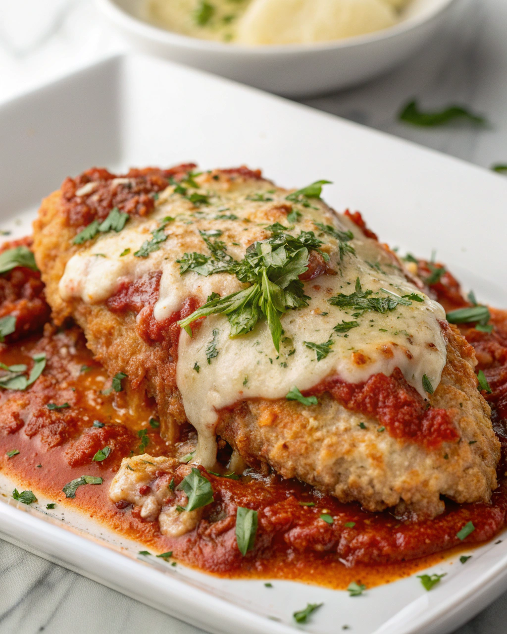 I spread half the marinara in the bottom of a baking dish, arrange the seared cutlets snugly, spoon more sauce over each one, then top each with about 1–2 oz shredded mozzarella and a sprinkle of extra Parmesan. If you like a bright note, add a little lemon zest now. The kitchen smells like roasted garlic and tomato — that warm, familiar aroma that makes mouths water.