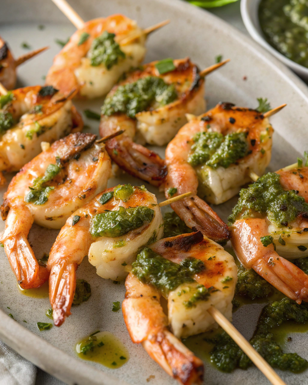 Serve with extra chimichurri on the side for dipping or drizzling. Garnish with a wedge of lemon and enjoy the burst of fresh herbs and smoky grilled shrimp!