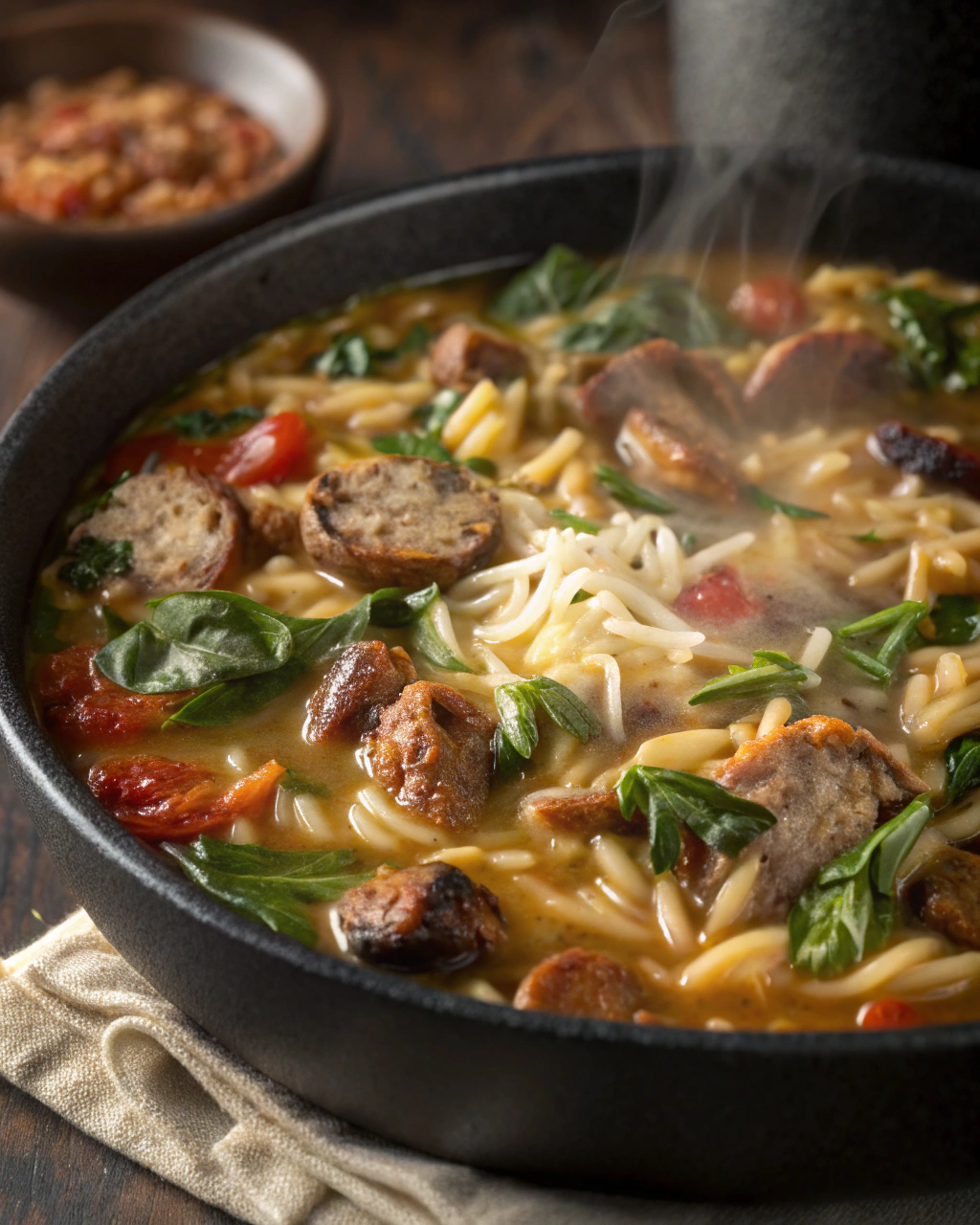 Hearty Sausage, Mushroom, and Spinach Orzo Soup