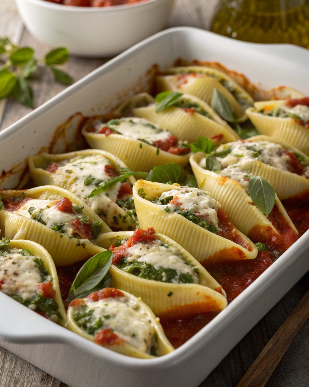 Carefully stuff each shell with a generous spoonful of the cheesy zucchini filling. Arrange the shells snugly in the baking dish. Once filled, spoon the remaining marinara sauce evenly over the shells.