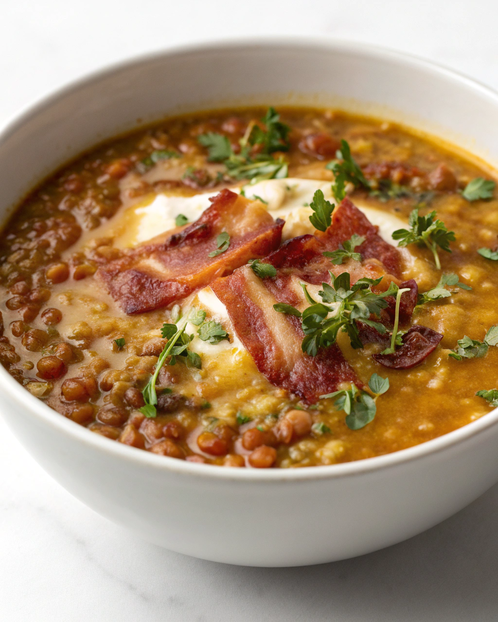 There’s something about the smell of simmering bacon and earthy lentils that instantly wraps you in a big, edible hug. This soup is my go-to when I need comfort in a bowl—thick, hearty, and packed with smoky goodness. Imagine soft, tender lentils soaking up all those savory bacon bits, mingling with sautéed onions and garlic until the kitchen smells like a cozy Sunday morning. Honestly, it’s the kind of recipe that feels like a warm blanket on a chilly day, inviting you back for another spoonful. Plus, it’s ridiculously easy to make, which means more time to settle in with a good book or binge-watch your favorite show while it cooks. Trust me, once you try this lentil and bacon soup, it’ll become your new favorite weeknight hug.