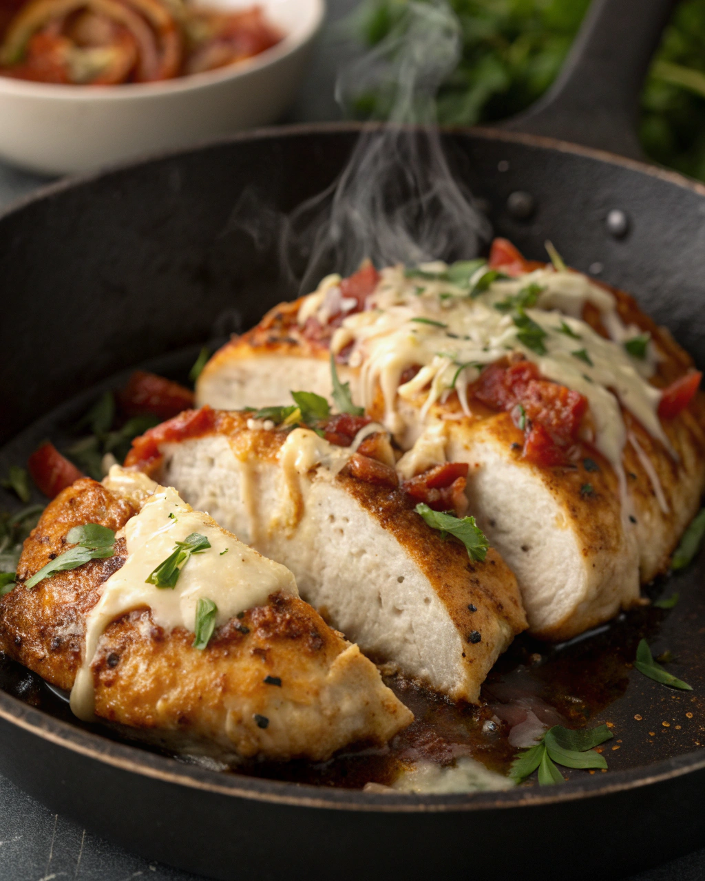 Transfer the skillet to the oven and bake for 8–12 minutes, depending on thickness. Check with an instant-read thermometer — pull the chicken at 165°F internal temperature. You want a golden exterior and a juicy center that gives slightly when you press it. If you don’t have a thermometer, cut into the thickest part; it should be white and tender, not chalky or grey.