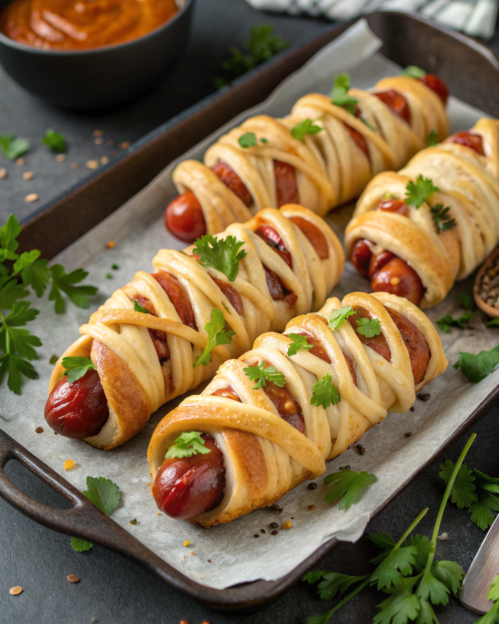 Okay, imagine it’s Halloween night, the spooky decorations are set, and the kids are buzzing with excitement—but dinner still needs to be quick, festive, and totally fun. That’s where these mummy wrapped hot dogs come in! They’re basically classic pigs in a blanket with a Halloween twist, wrapped up in strips of dough to look like little mummies. The crispy, golden pastry and the warm, juicy hot dog inside make for a perfect combo that kids love. Plus, they’re ridiculously easy to whip up and you can customize the “eyes” with anything from ketchup dots to tiny mustard circles. Ready to bring some silly, tasty fun to your Halloween table? Let’s go!