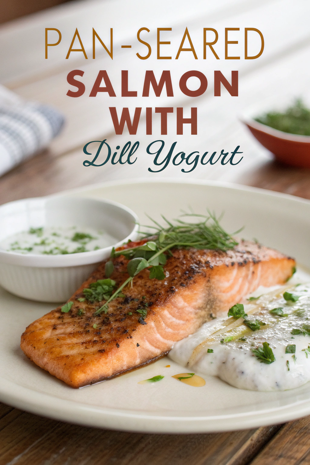Plate the salmon, spoon a generous dollop of the dill yogurt alongside, and finish with lemon zest and wedges. Sprinkle extra dill or a drizzle of olive oil if you’re feeling fancy. The cool, creamy sauce contrasts the warm, crisp fish — that first bite should be bright, tangy, and buttery.