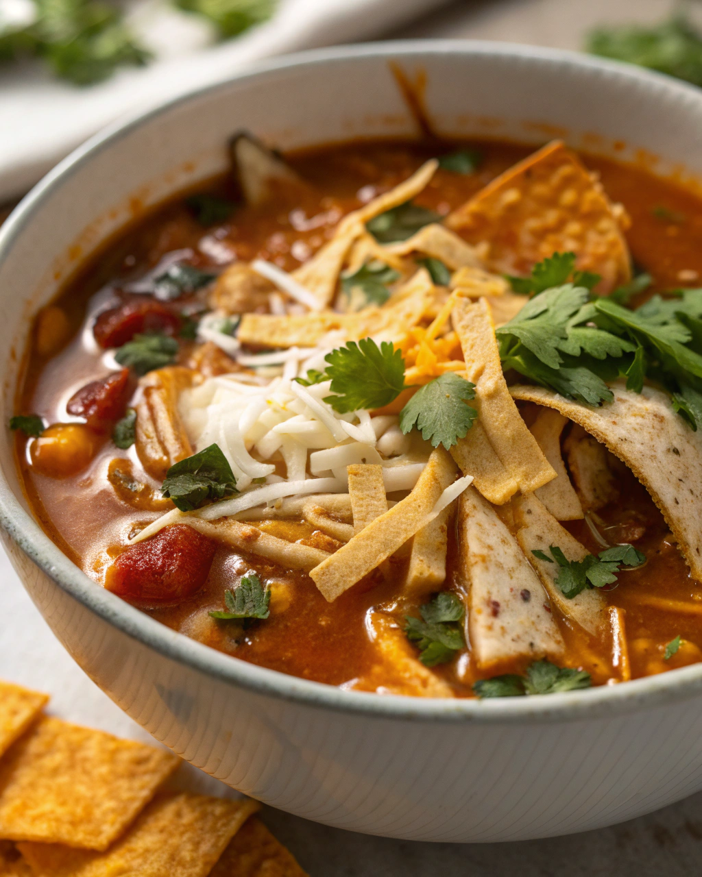 This soup tastes like it simmered all day but actually comes together fast — perfect for weeknights or when you want comfort without fuss. The broth sings with savory chicken, smoky chili powder, and bright lime, while toasted tortilla strips add a satisfying crunch. It’s forgiving, flexible, and full of color and texture — orange corn kernels, ruby tomatoes, green cilantro — and yes, it smells like home.