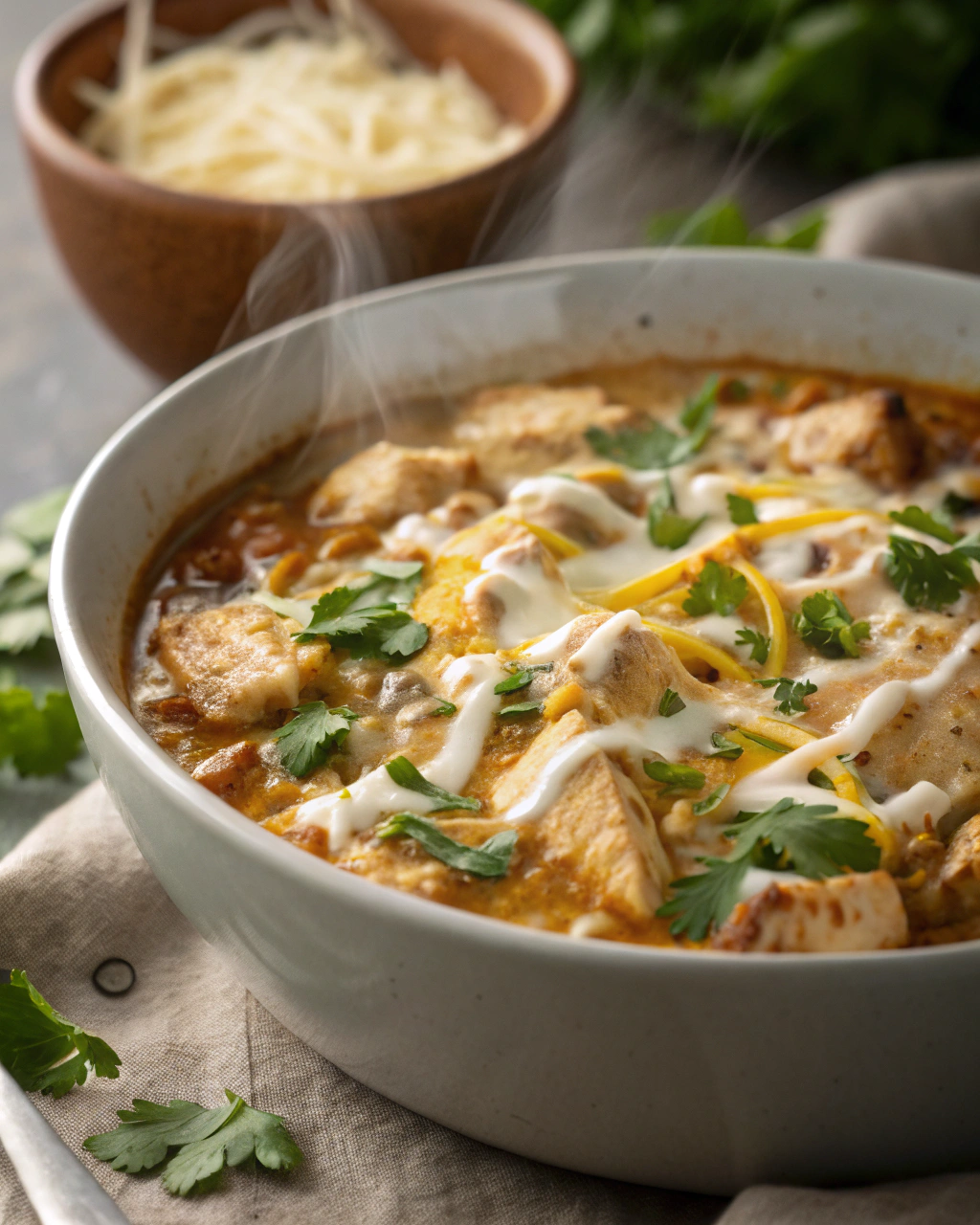 This white chili balances creamy and bright: soft **white beans**, tender **shredded chicken**, and a gentle kick from **green chiles**. It’s comforting but not heavy, perfect for weeknights or a game-day spread. The texture? Silky broth, pillowy beans, and slightly crisped edges if you broil a cheese-topped bowl. It’s so easy even your oven can’t mess it up — and the aroma will have everyone hovering by the pot.