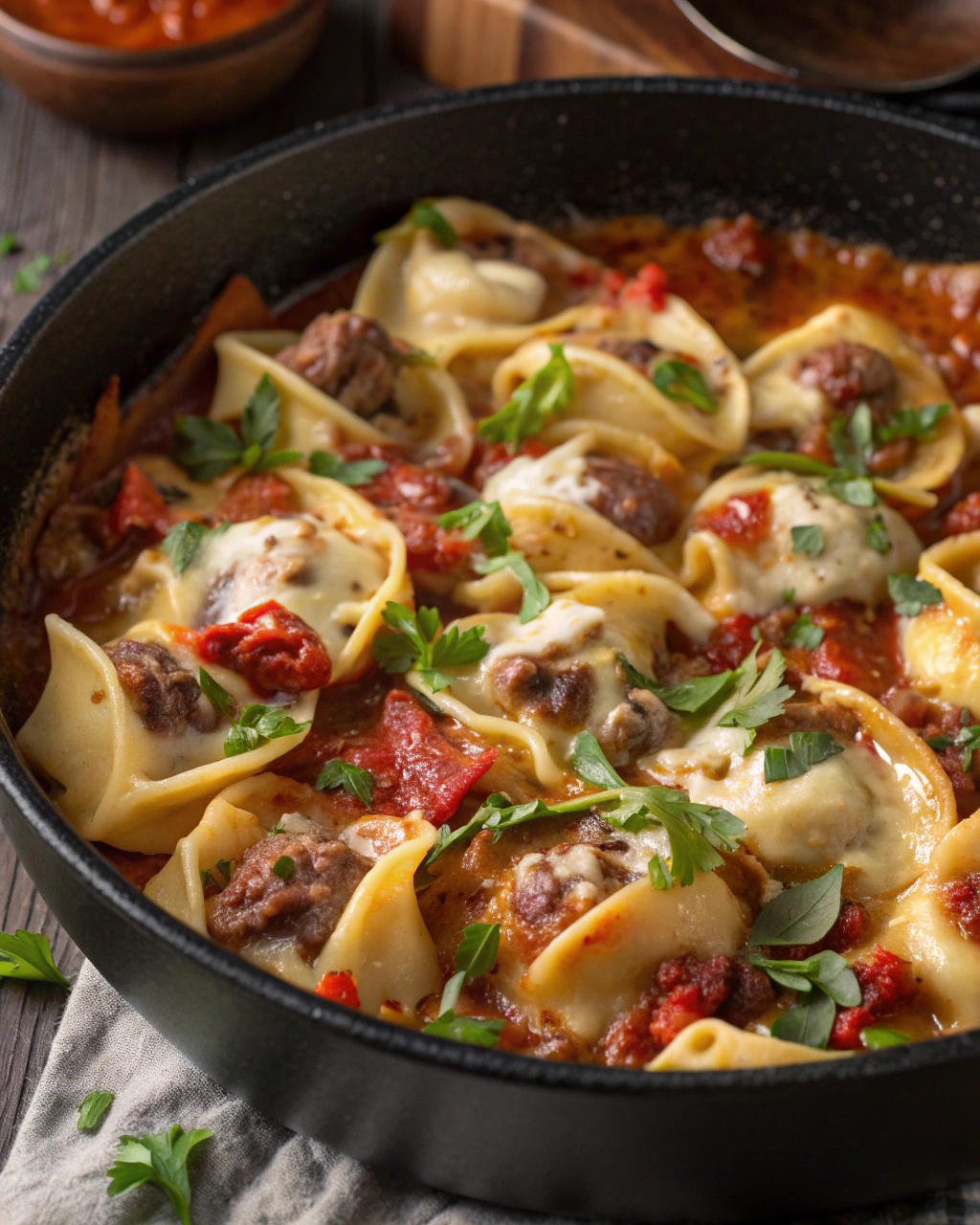 Add the steak back into the skillet along with the cooked tortellini. Sprinkle the provolone and mozzarella cheeses over everything, stirring gently until everything is melted, gooey, and perfectly combined.