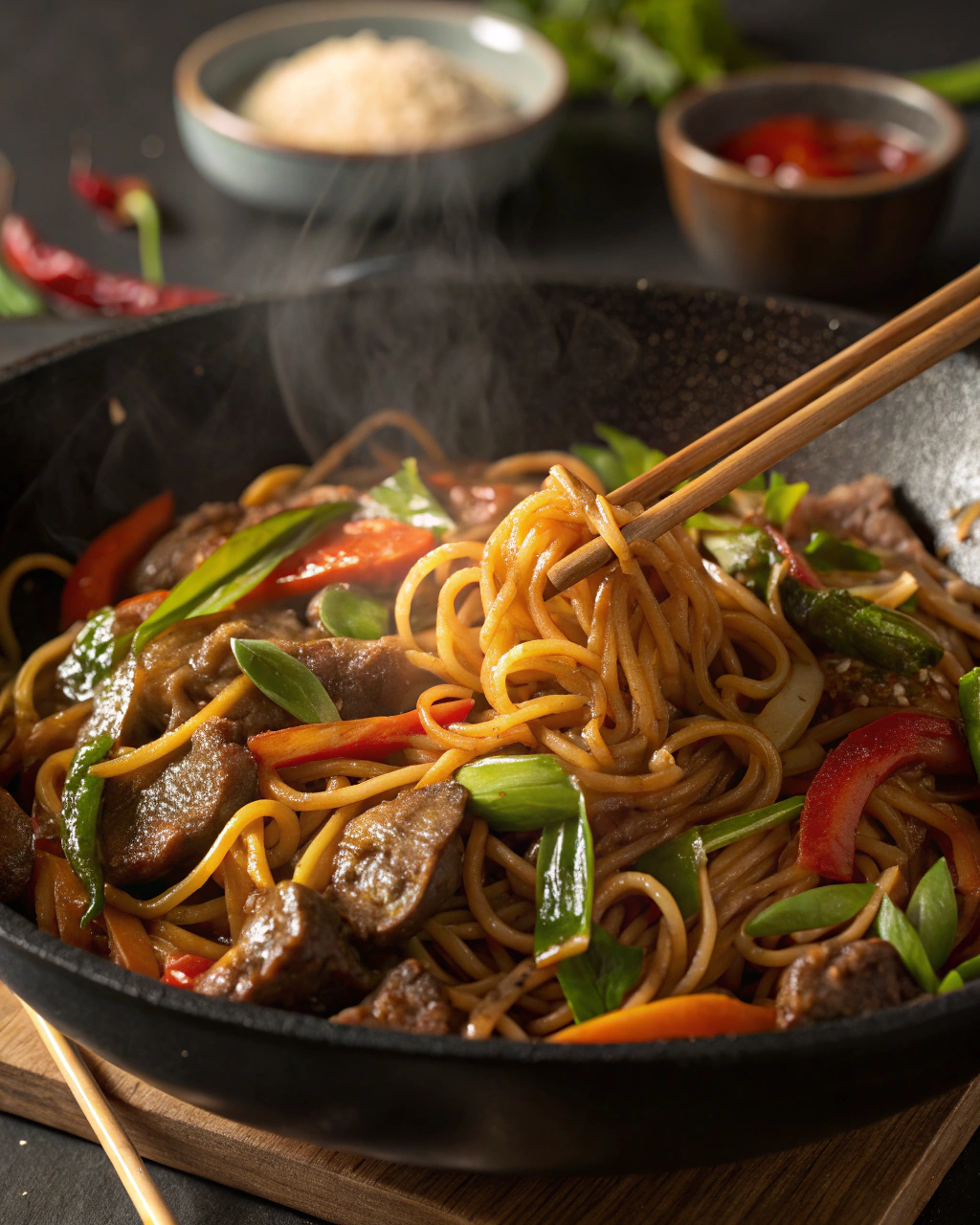 Toss constantly for 2-3 minutes so the noodles soak up that savory sauce and the beef finishes cooking. You want everything coated in a glossy, flavorful sheen.