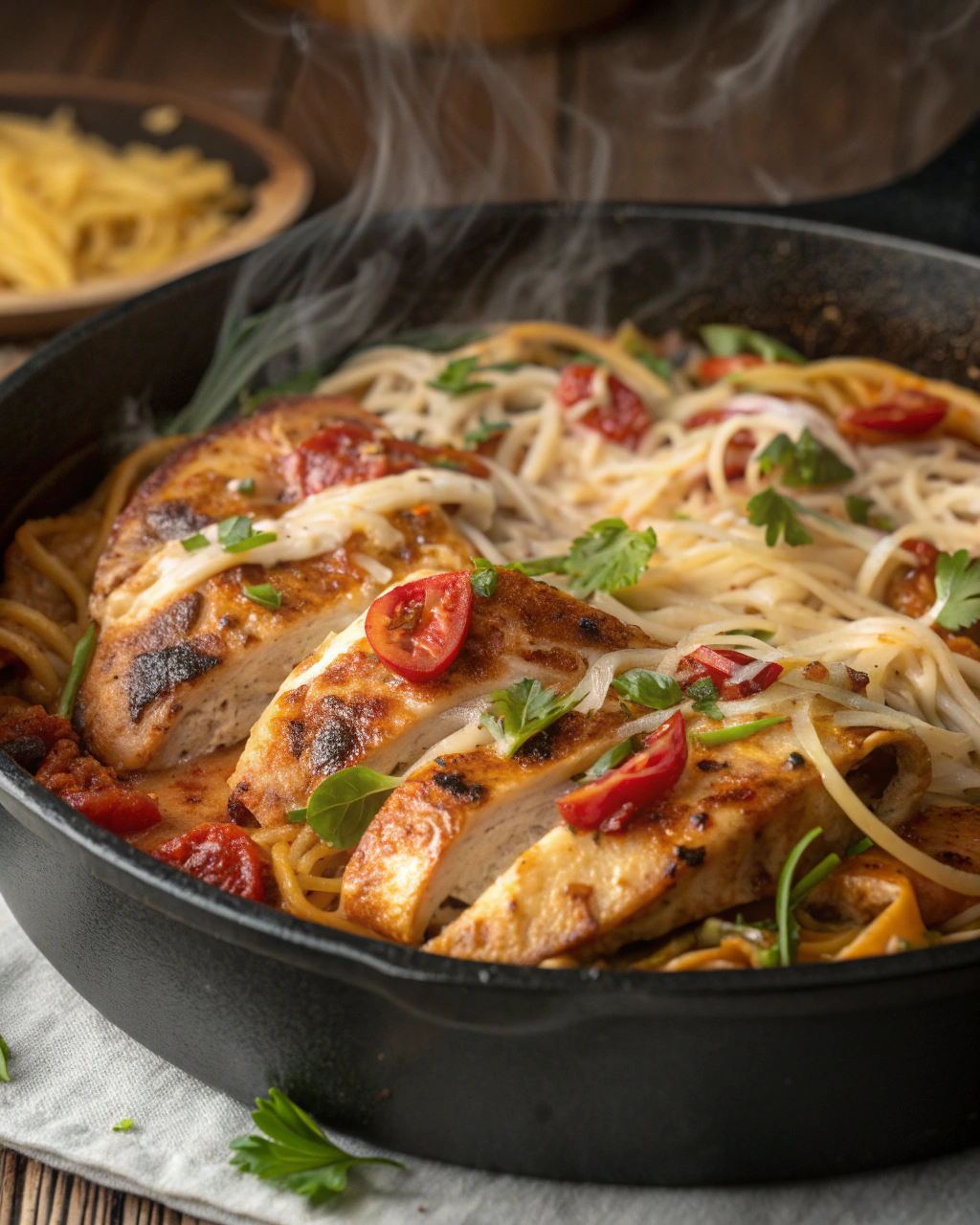 Finish with juice of 1/2 lemon and a pat of butter if you like extra silkiness. Scatter chopped parsley or scallions and freshly cracked pepper. Serve straight from the pan while the steam carries that smoky, garlicky perfume — the noodles should feel tender and the chicken should hit 165°F when you poke it with a thermometer.