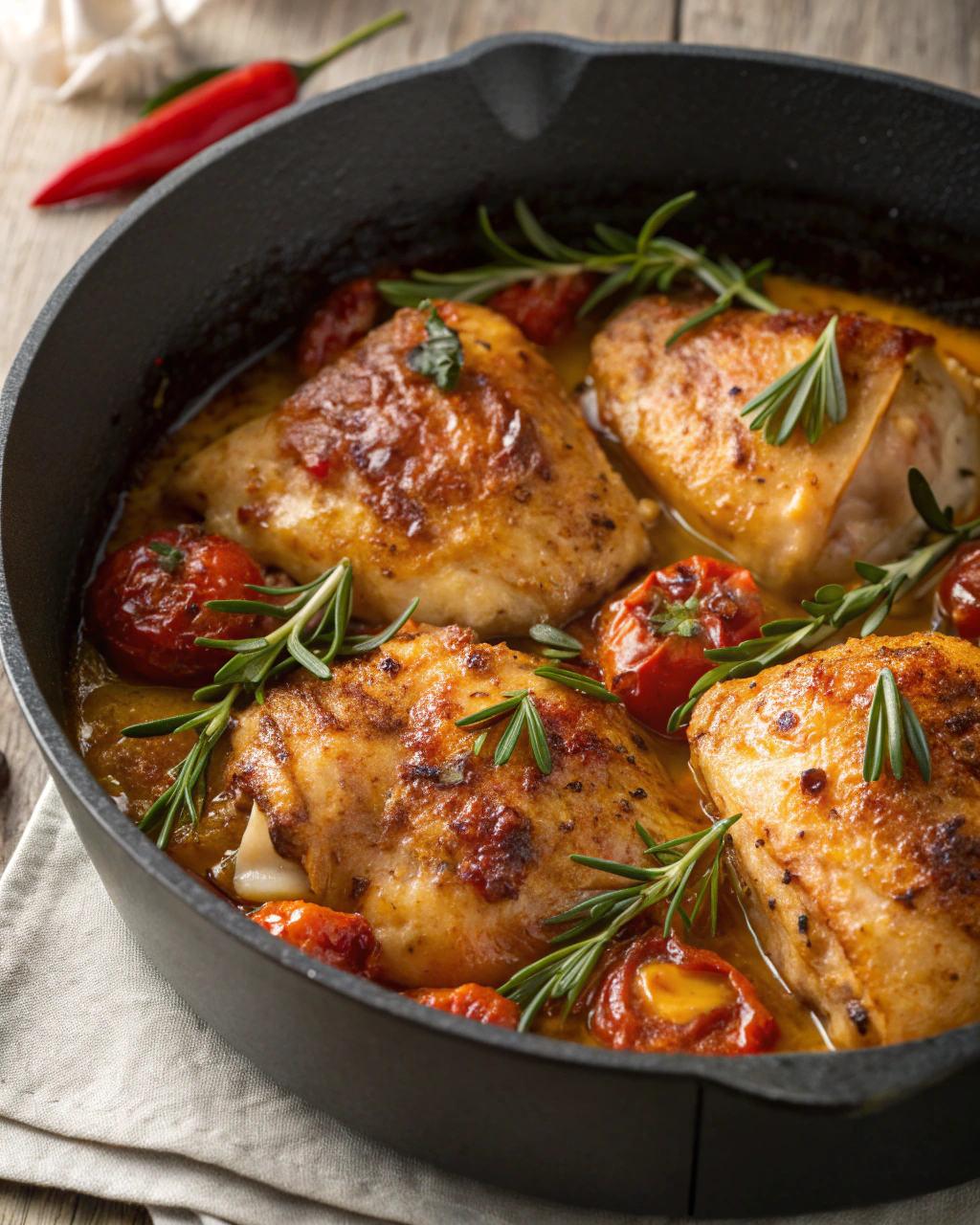 Flip the thighs so the skin side faces up, tuck the smashed garlic cloves and rosemary around the chicken, and add 3 tbsp butter to the pan. Spoon a little melted butter over the tops once or twice. Slide the skillet into the oven and roast at 425°F for 18–22 minutes, or until the internal temperature reaches 165°F and juices run clear. The oven will caramelize the fond on the pan and thicken the juices into a quick sauce.