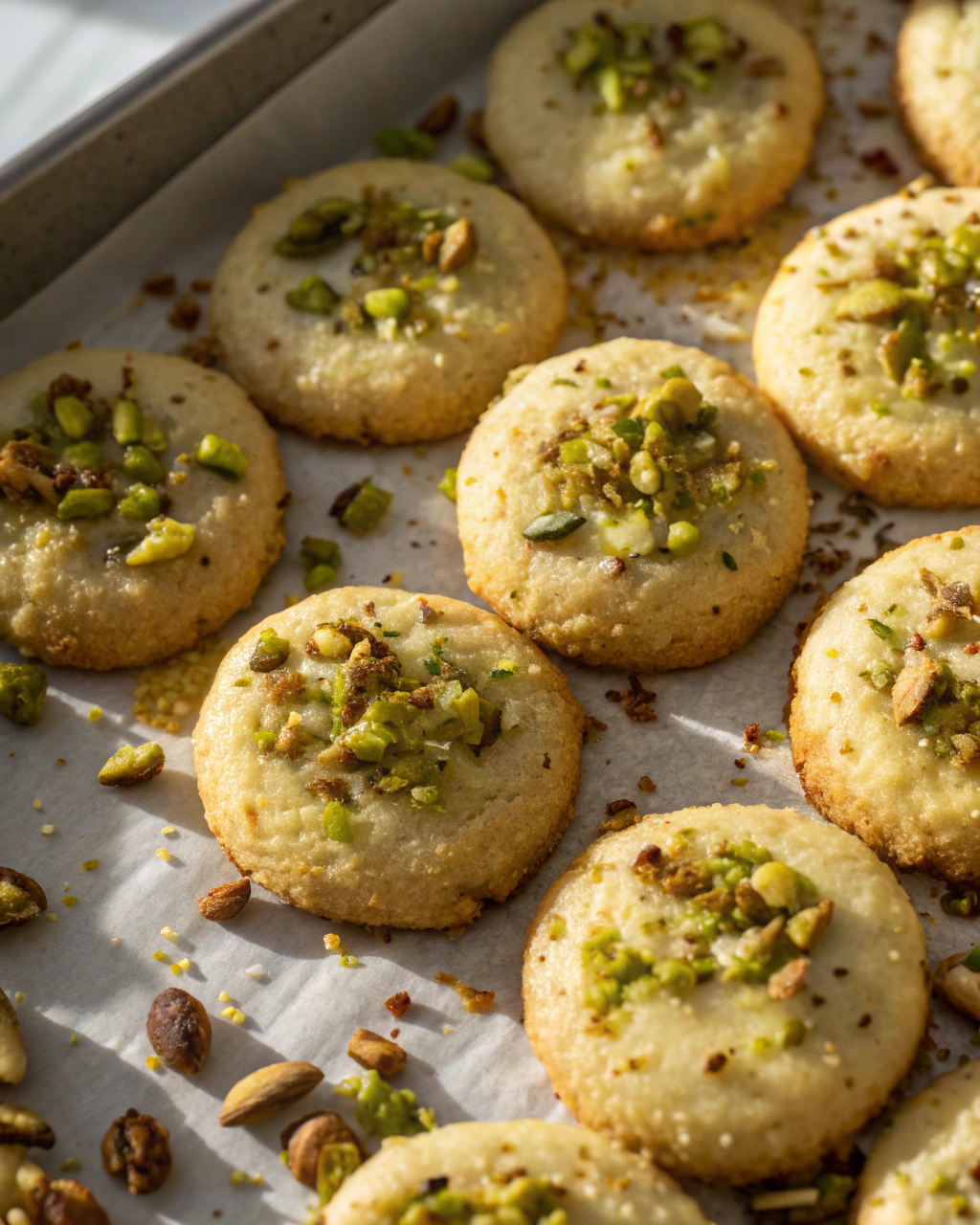 These cookies are perfect alongside a hot cup of coffee or afternoon tea, especially when you want a little treat that feels special but isn’t fussy. In spring, they’re fantastic with a glass of sparkling lemonade, and during the holidays, they make a stunning addition to cookie platters thanks to their pretty green pistachios.