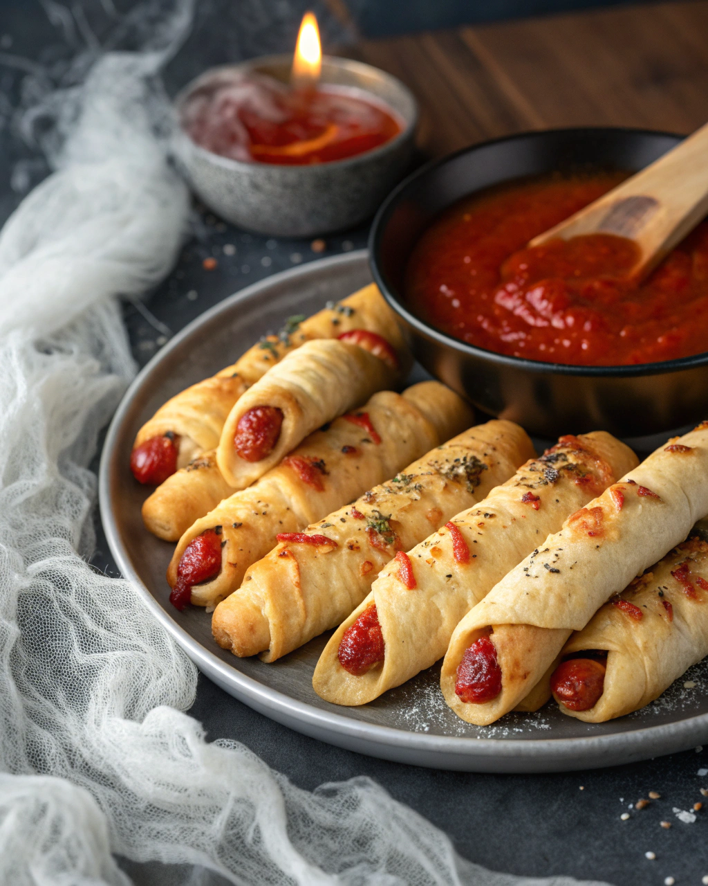 I love setting these creepy breadsticks out on a dark platter with little bowls of marinara “blood” for dipping. It’s perfect for a Halloween party spread alongside spooky deviled eggs or pumpkin-shaped cheese balls. Guests always get a kick out of the visual—and the mix of crunchy, buttery bread with tangy marinara is a home run every time.